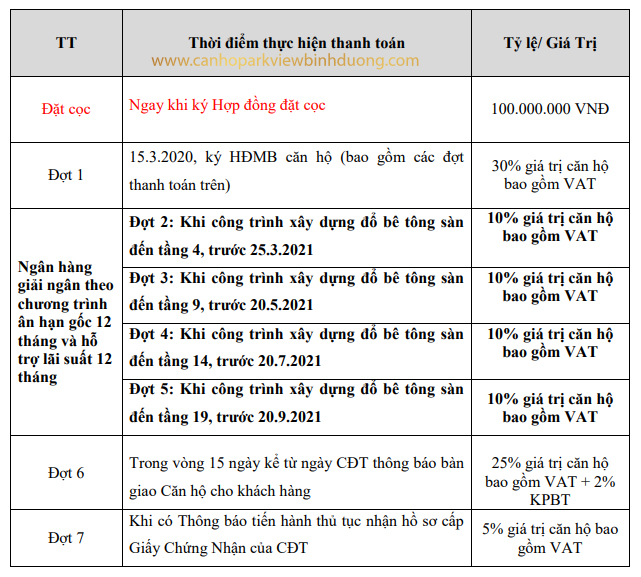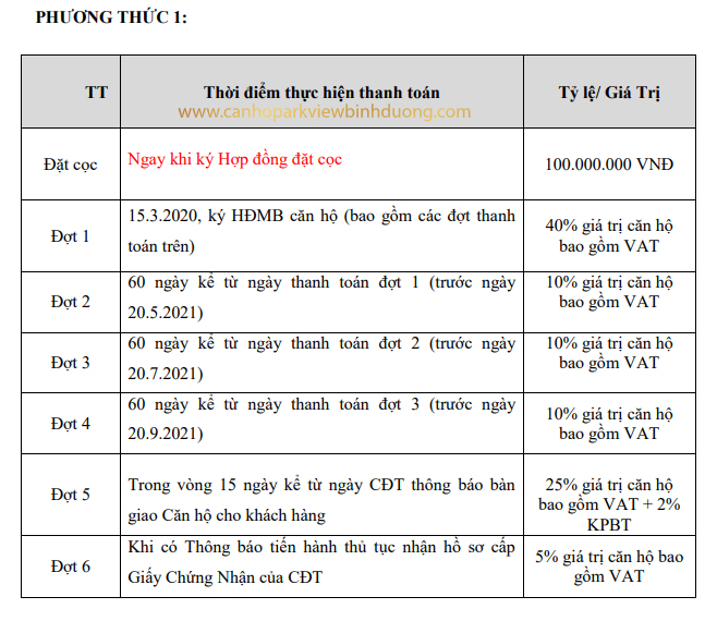| Phương thức thanh toán dự án Parkview Apartment Bình Dương |