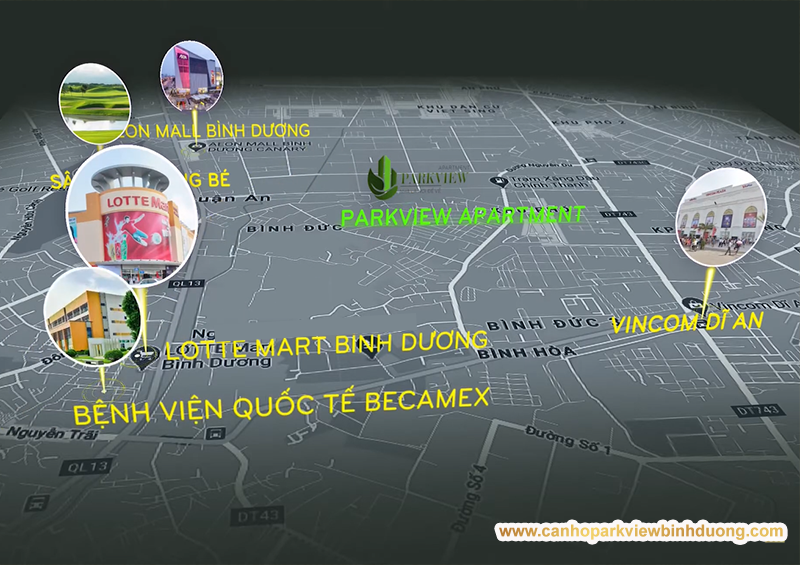 Cư dân Căn hộ chung cư Parkview Apartment Bình Dương có thể tiếp cận các tiện ích hiện đại chỉ trong vòng 5 - 30 phút: Chợ Bình Đáng, trung tâm thương mại Aeon Mall, sân Golf Sông Bé, Lotte Mart, Bệnh viện quốc tế Becamex...